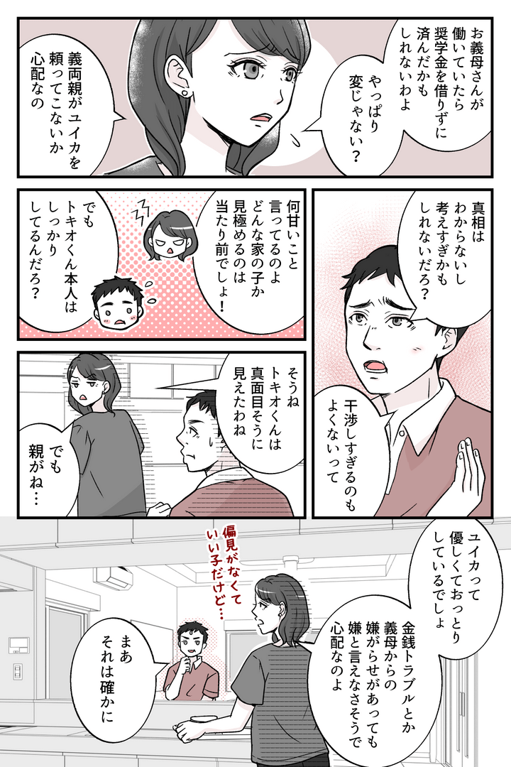 娘が帰ったあと、夫と話し合います。やはり夫も相手の家庭事情が気がかりなようです。あまり娘にうるさく言うと反発されると思い、強く言えませんでしたが、自分が働くことよりも子どもに奨学金を借りさせるほうを選ぶような親ならば、将来的にも子どもにお金の面で迷惑をかけるのではないかと不安になります。