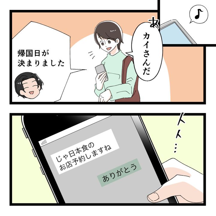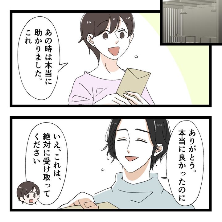 食事の約束をした日。カイさんはお金は返さなくていいと言っていましたが、そういうわけにはいきません。「あの時は本当に助かりました。これ」と封筒を差し出すと、「ありがとう。本当によかったのに」と遠慮するカイさんに「いえ、これは、絶対に受け取ってください」ときっぱり言って封筒を受け取ってもらいました。