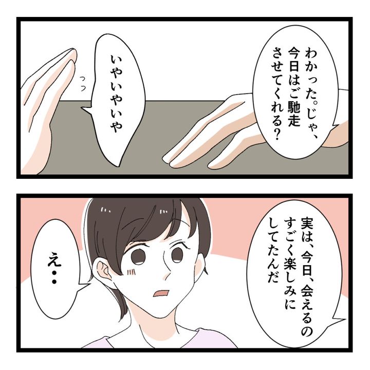 すると、「わかった。じゃ、今日はご馳走させてくれる?」と言い出すカイさん。え?今日は私がご馳走する約束だったよね・・と思い「いやいやいや」と断ろうとすると、カイさんが「実は、今日、会えるのすごく楽しみにしてたんだ」と言いました。予想外の言葉に私は「え・・」と固まりました。