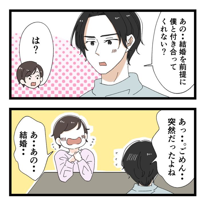 さらに「あの・・結婚を前提に僕と付き合ってくれない?」と唐突にカイさんが言うので、思わず「は?」と目が点になってしまいました。私の驚きようを見て「あっ・・。ごめん・・突然だったよね」と謝るカイさんに「あ・・あの・・結婚・・」と私はパニック。