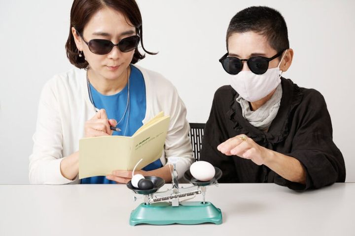 まずは天秤にラブパール・ライトと卵をのせて、どちらが重いかを実験。一般的な卵一個の重さは60~70g程度。対してラブパール・ライトの重さは 42g。「卵の方が下がったということは、やはりライトの方が軽いのですね!」(編集・M)