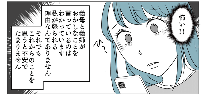 夫が状況を理解してくれていることが救いですが、私は義姉と義母が怖くてたまりません。