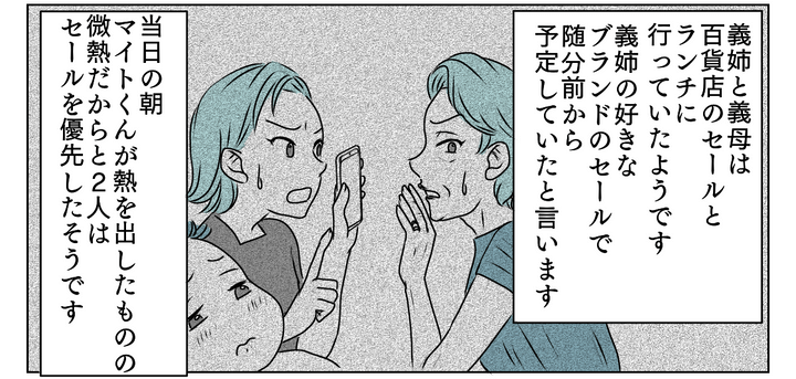 私が帰宅すると、夫から甥の体調が回復してきていること、義姉と義母が買い物に出かけていたことを聞きました。義父と義兄は、義姉たちが発熱した甥を夫に預け、買い物に行っていたことを知らなかったそうです。