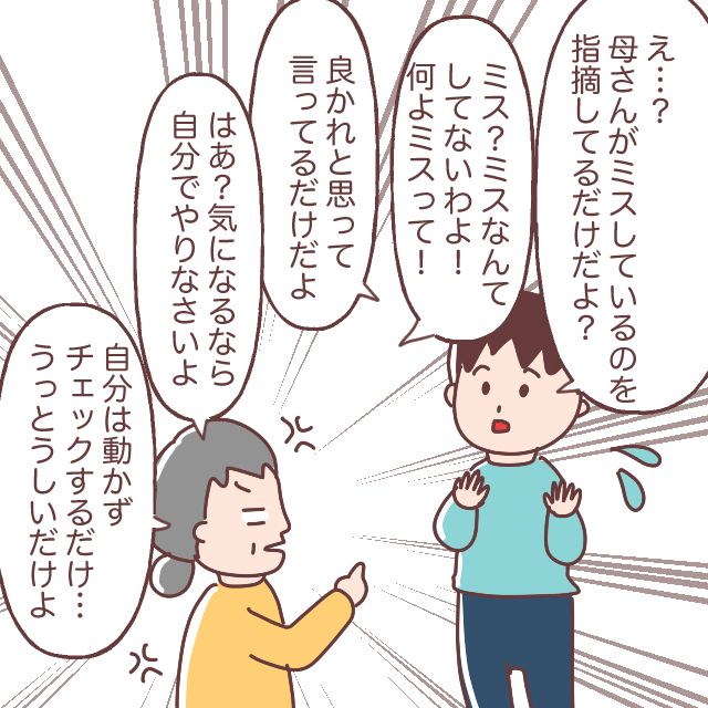 すると、「え・・?母さんがミスしているのを指摘してるだけだよ?」夫の言葉に、「ミス?ミスなんてしてないわよ!何よミスって!」とさらにキレる義母。「良かれと思って言ってるだけだよ」と夫が言うと、「はあ?気になるなら自分でやりなさいよ。自分は動かずチェックするだけ・・うっとうしいだけよ」義母の怒りはおさまりません。