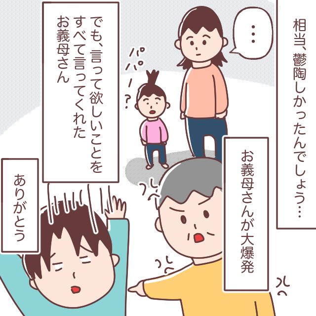 靴が揃っていない、シャンプーリンスの向きが揃っていない、冷凍食品の消費期限など、細かいところを見つけてはチクチク言ってくる夫タイチさんにうんざりしていた妻ハルさん。「教えてあげている」というスタンスを崩さず自分では何もしないタイチさんにイライラを募らせていましたが、とりあえず「はーい」と返事をしておけばタイチさんはそれ以上詮索しないことに気付いたハルさんは、イライラ回避のために何か言われるたびに「はーい」と返事だけすることにしていました。ある日義実家に家族で訪問した際、「スリッパ出さないの?」と玄関で言ったところから始まり、トイレットペーパーの切れ目がズレている、洗濯物の干し方が雑などと義母のやり方にチクチク言いだしたタイチさんにさすがに困惑した義母は「いつもこうなの?」とハルさんに質問。ハルさんは「あ、はい・・」としか答えられず、一緒に夕飯を作ることに。すると、卵焼きを焼こうとしていた義母の所へ行き、「卵の白いところ取らないの?」とまたチェック!「うちではとったこと無いわよ」と言った後、「さっきからチクチクチクチク・・あんた何様のつもり!?」と義母がキレました。