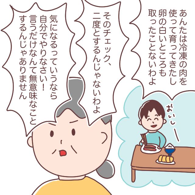 「あんたは冷凍の肉を使って育ってきたし、卵の白いところも撮ったことないわよ!」「そのチェック、二度とするんじゃないわよ!」「気になるっていうなら自分でやりなさい!言うだけなんて無意味なことするんじゃありません」と義母がまくし立てました。