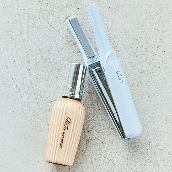 上:小回りが利くアイロン。リファフィンガーアイロン ST ホワイト¥14,500(MTG)、下:ヒートケア成分がキューティクルを整えて日中の湿気や乾燥から髪を守ります。リファマエガミロック 100g ¥2,800(MTG)