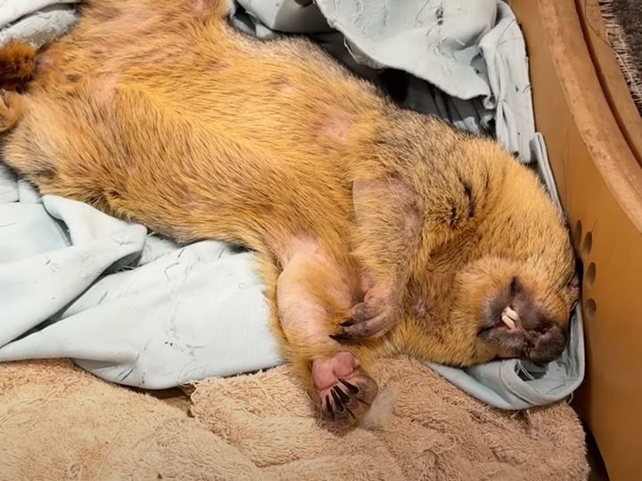3. タオルを集めてへそ天で爆睡するマーモットさん、仲間のちょっかいにも全然起きない