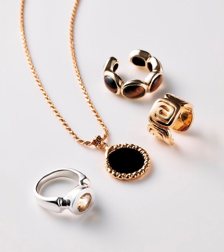 上から:リング[SV×タイガーアイ]¥66,000、リング[SV×K18YGP]¥35,200、ネックレス[SV×K18YGP×オニキス]¥62,700、リング[SV×シトリン]¥56,100(全てGAGAN)