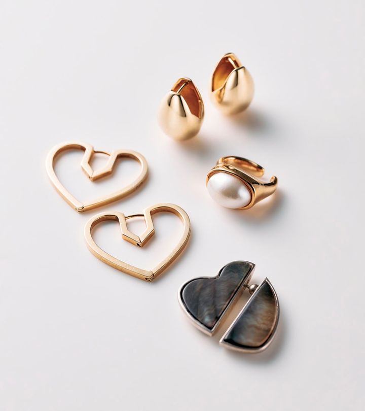 右上から時計回りに:ピアス[SV×YGP]¥35,200、イヤーカフ[SV×YGP×淡水パール]¥30,800、ハートシェルピアス[SV×ブラックシェル]¥35,200、ハートゴールドピアス[SV×YGP]¥29,700(全てプラウ)