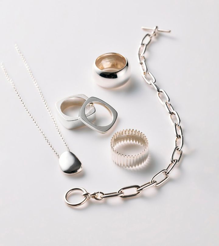 右:ブレスレット[SV]¥13,200、中央上:リング[SV]¥8,800、中央で重ねたスクエアリング上[SV]¥8,800、スクエアリング下[SV]¥13,200、中央下:ギザギザリング[SV]¥13,200、左:ネックレス[SV]¥14,300(全てビョーカ)