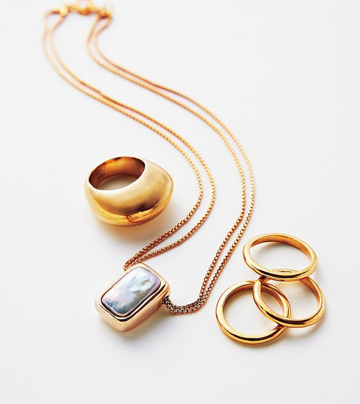 左:リング[SV×K18YGP]¥29,700、中央:ネックレス[SV×K18YGP×淡水パール]¥37,400、右:トリプルリング[SV×K18YGP]¥22,000(全てコウ)