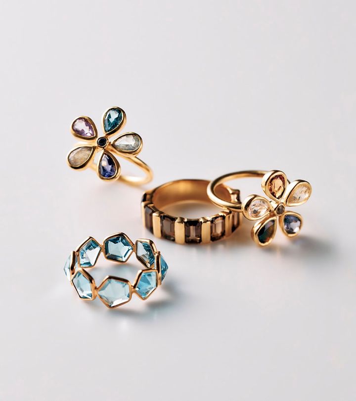 左上:花リング[SV×K18YG×ロンドンブルートパーズ×ブルートパーズ×アイオライト×タンザナイト×ラブラドライト×アメシスト]¥38,500、右:花リング[SV×K18YG×スモーキークォーツ]¥35,200、中央:マルチカラーリング[SV×K18YG×ブラウントルマリン×ルチルクォーツ×アイオライト×イエローサファイア×オニキス×クリアクォーツ]¥38,500、左下:リング[K18YG×ブルートパーズ]¥99,000(全てウパラ/パサンド バイ ヌキテパ)