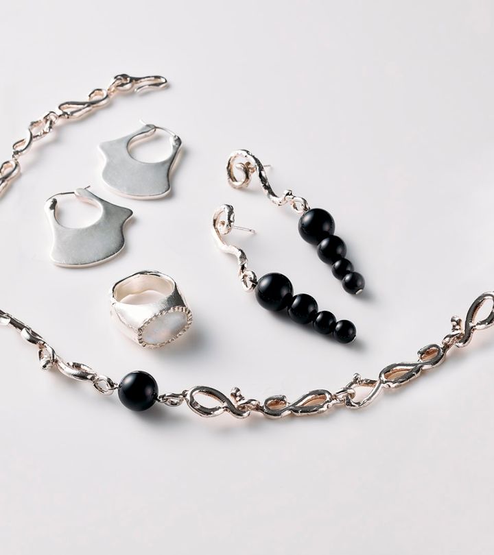 左下:ネックレス[SV×オニキス]¥48,400、左上:ピアス[SV]¥35,200、右上:ピアス[SV×オニキス]¥31,900、中央:リング[SV×ホワイトラブラドライト]¥49,500(全てゴーエン)