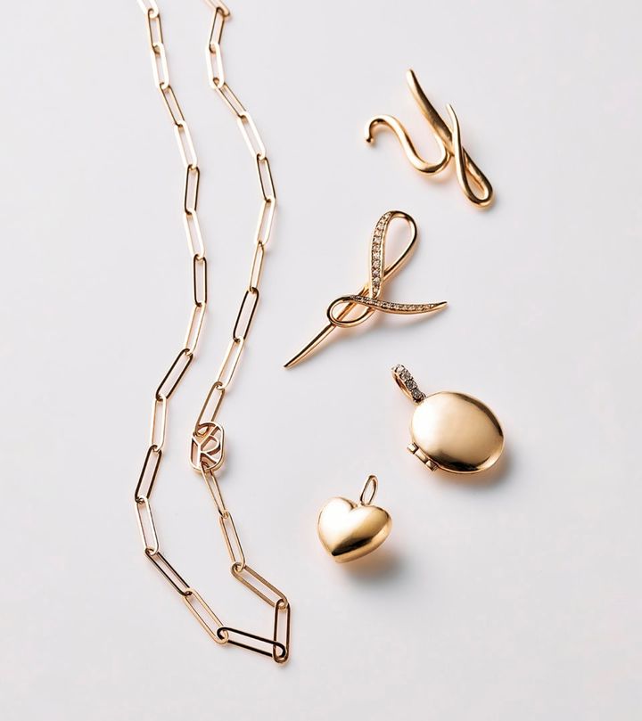 左から時計回りに:ネックレス[K18YG]¥396,000、チャームY[K18YG]¥176,000、チャームS[K18YG×DIA]¥154,000、ロケット[K18YG]¥198,000、チャームハート[K18YG]¥308,000(全てロワ)