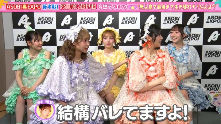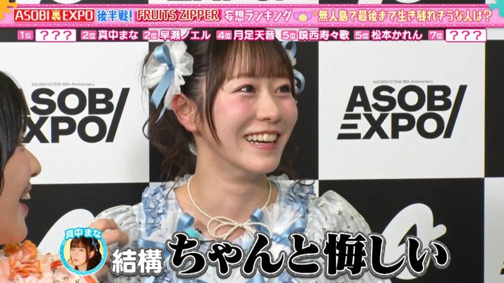 FRUITS ZIPPERの5人を深掘りすべく「原宿で50人に聞いた FRUITS ZIPPER妄想ランキング」を実施。後半戦のテーマは「無人島で最後まで生き残れそうな人は?」。前回放送された「ライブで1番緊張しなさそうな人は?」で最下位となった真中は、「これは自信がある!食べ物も好き嫌いないし、体力も自信がある」と返り咲きに期待を込める。しかし「一個懸念点を挙げるとしたら、泳げない」とまさかのウィークポイントを告白。