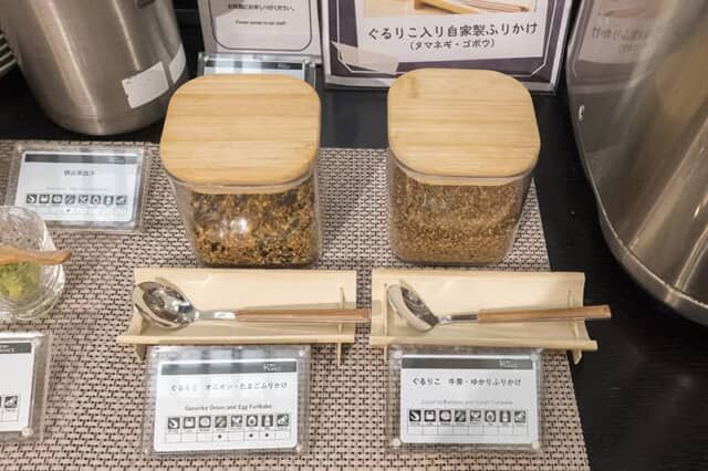 SDGsなふりかけも注目です。規格外の野菜や食品工場などで出る端材を、粉末化したタマネギやゴボウのパウダー「ぐるりこ」は、埼玉県の会社が製造。ホテルではそれぞれタマネギのぐるりことたまご、ゴボウのぐるりことゆかりを合わせ、自家製のふりかけを作りました。