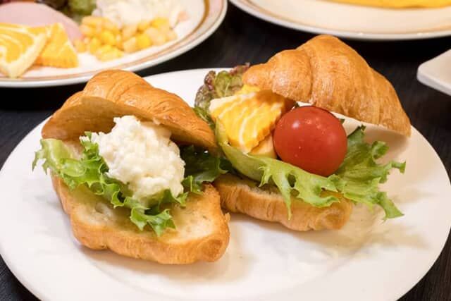 シェフに頼むとクロワッサンを切ってくれるので、野菜やチーズ、ベーコンなどをはさんでセルフのオープンサンドを作れます。