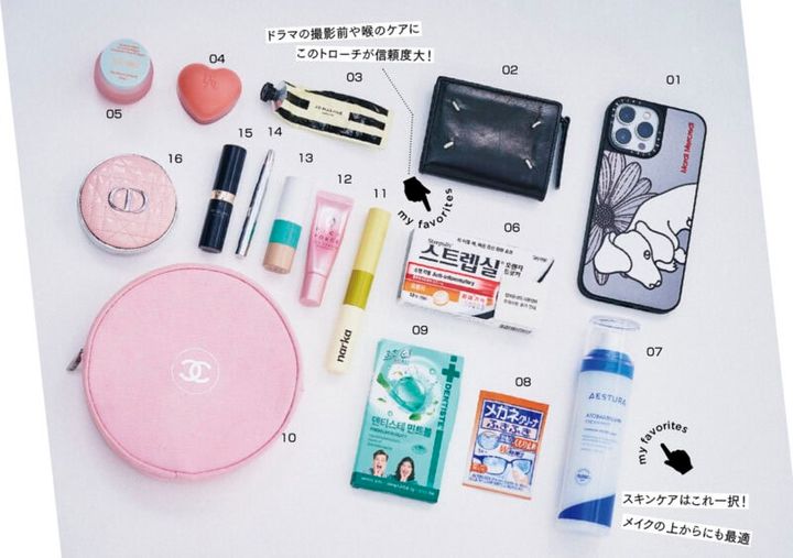 01マルディメクルディ×ケースティファイのスマホケースはキャッチーな柄で、バッグの中でも見つけやすい。02膨らまないようにカードのみ収納しているメゾン マルジェラの財布。03ジョー マローン ロンドンのハンドクリームはいただきもの。手洗いをした後にすぐに手肌を保湿。04デイジークのスフレカラーポットでリップラインをカバー。05トコボのリップマスクはバームタイプでのびがよくしっとり唇に。06韓国に帰った時に薬局でストック買いするストレプシルのトローチ。オレンジ味でおいしく効果もテキメン。07エストラのアトバリア365 クリームミストはひと吹きで保湿と潤いが叶う。08スマホ画面のクリーナーとして。09デンティスのミントボールで口腔ケア。10香水を購入した時のノベルティポーチは、内側が汚れにくい仕様で便利。11前髪を整えるナルカのヘアマスカラ。12リピート買いしているライスフォースのリップセラム。13気分が上がるエルメスのリップ。14フィリミリのリップブラシ。15クレ・ド・ポー ボーテのコンシーラー。16お直し用に持ち歩いているディオールのクッションファンデ。