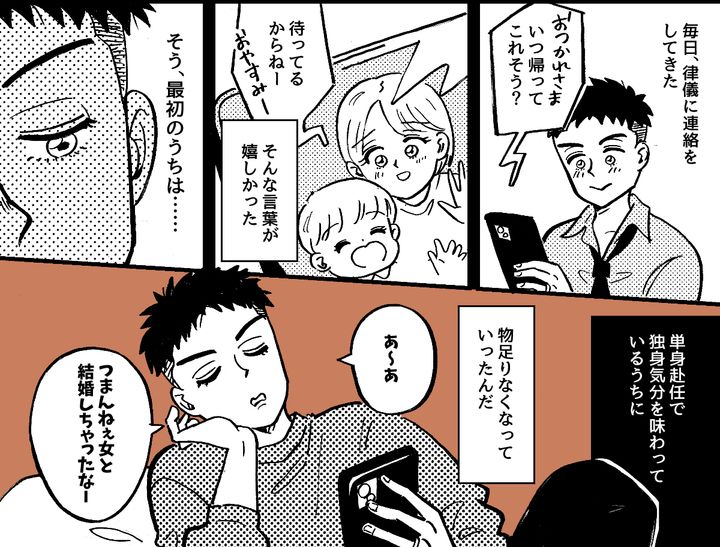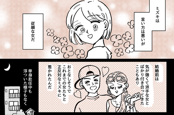 ミズキは単身赴任中も浮ついた様子もなく、毎日律儀に連絡してきた。「いつ帰ってこれそう?」「待っているからね」そんな言葉が嬉しかった。そう、最初のうちは……。でも単身赴任で独身気分を味わっているうちに、だんだんと物足りなくなっていった。ちょっとミズキにいじわるをしてやろう! そんな気軽な気持ちだったんだ。