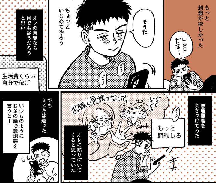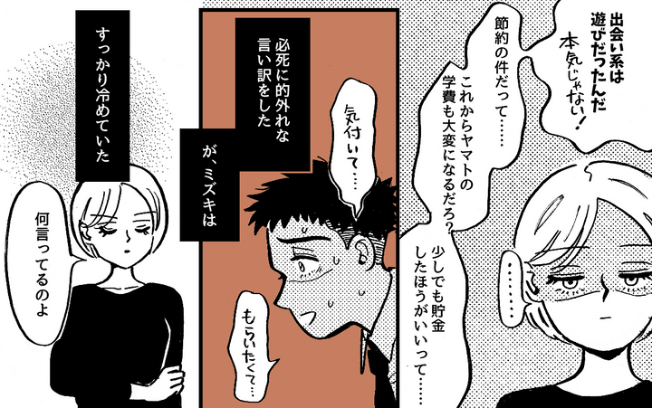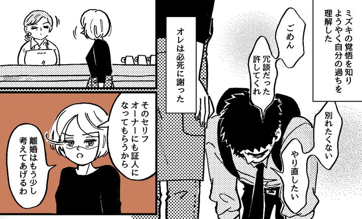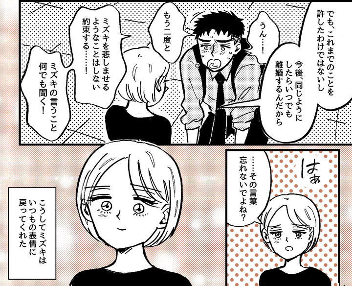 オレは必死に言い訳をした。それでも許してくれないミズキに、彼女の覚悟を知り、ようやく自分の過ちを理解した。オレはミズキに土下座せんばかりの勢いで謝った。「ごめん」「冗談だった」「許してくれ」「別れたくない」「やり直したい」。オレは必死に謝った……ミズキはいつもの優しい表情に戻ってくれた。オレは、ギリギリのところでミズキの優しさに救ってもらったのだろう。