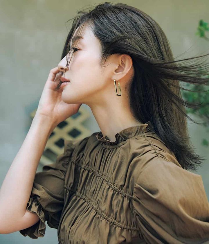 ブラウス¥16,500(マイストラーダ)ハーフパンツ¥26,400(カデュネ)ピアス¥27,500(ブランイリス/ブランイリス トーキョー)インナー(スタイリスト私物)