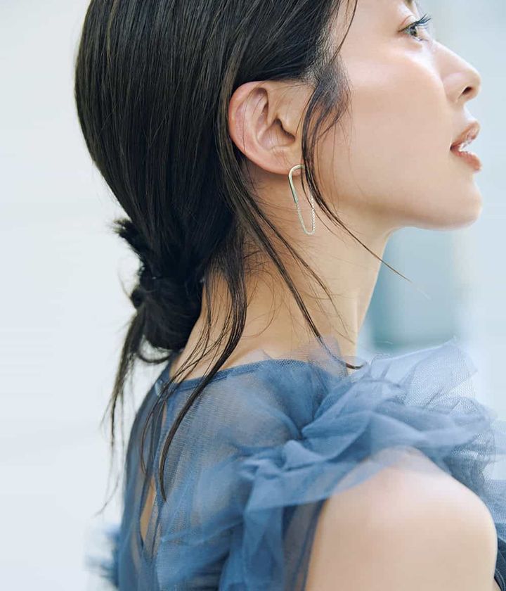 ブラウス¥20,900(サロン アダム エ ロペ/ジュンカスタマーセンター)スカート¥13,970(Mila Owen/Mila Owen ルミネ新宿2店)ピアス¥25,300(プラウ)ブレスレット¥15,400〈イットアトリエ〉リング¥35,200〈ミチ ウィルウェイ〉(ともにフォーティーン ショールーム)インナー(スタイリスト私物)