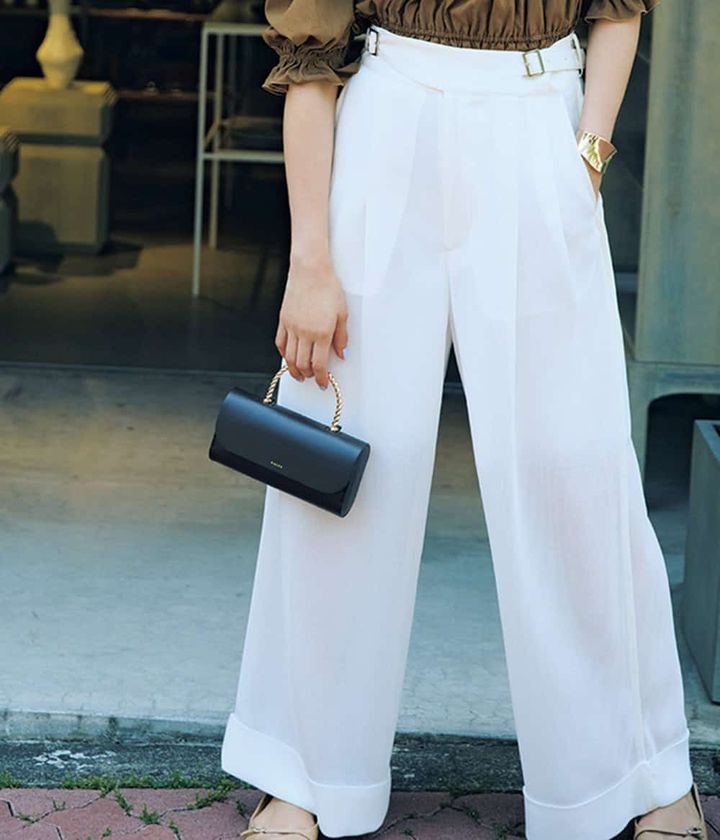 パンツ¥28,600(MIESROHE/MIESROブラウス¥9,900(Mila Owen/Mila Owen ルミネ新宿2店)バッグ¥88,000(サルチェ/フラッパーズ)パンプス¥42,900(ヒューン/クルーズ ショールーム)ピアス¥50,600(フェルセラ/ズットホリック)バングル¥11,550(Hh/フォーティーン ショールーム)