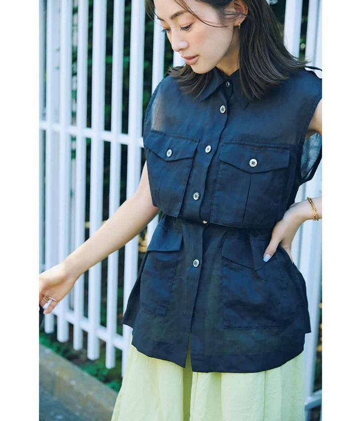 日焼け風ブラウンチークが夏に映える。上品なシアー感が好印象ハンサムなトップスに涼を宿して。きりっとしたブラックのシャツジャケットも〝透け〟なら軽やか。小物やふんわりスカートで甘盛りしても媚びずに大人。