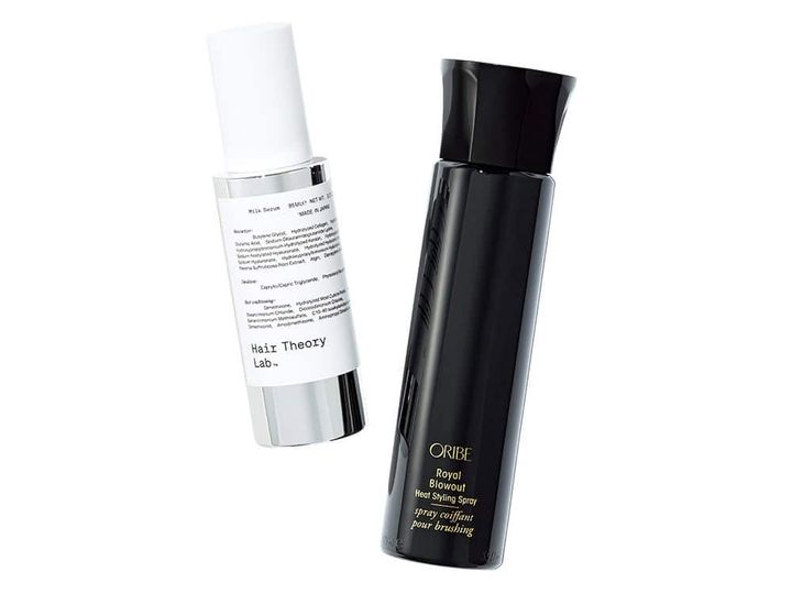 〈右〉ORIBE ロイヤルブローアウト ヒートスタイリング ヘアスプレー¥9,130(花王サロンジャパン)〈左〉ヘアセオリーラボ ヘアミルクセラム¥4,840(dr365)