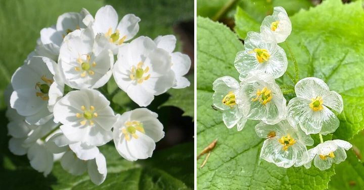 濡れると透明になるサンカヨウ / Credit:(左)Wikipedia Commons , (右)Wikipedia Commons