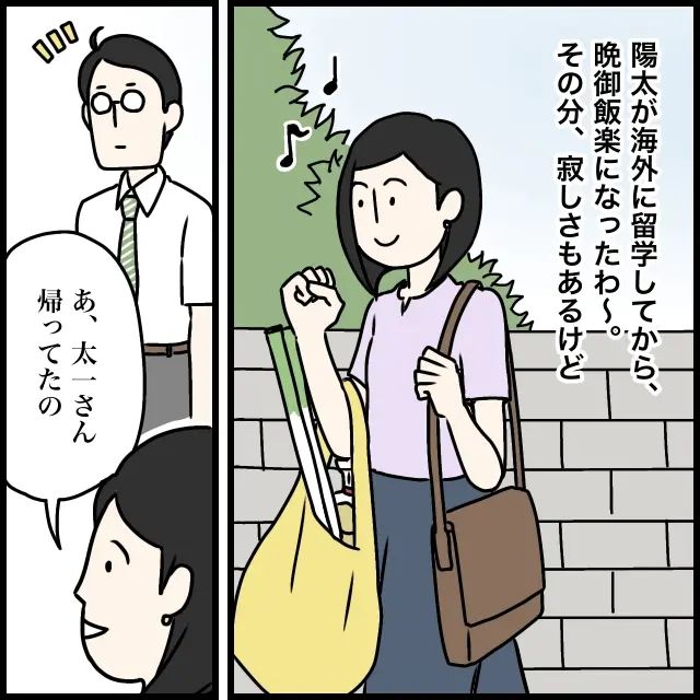 息子陽太くんは海外留学中で、夫と私はなんだか新婚時代に戻った気分。新鮮でいいかもと思っていたのですが、ある日突然、家にやって来た元カノきらりちゃんとそのご両親にビックリ!不機嫌そうなご両親の様子に不安が募りました。