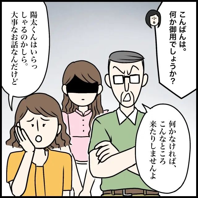 急いで、「こんばんは。何か御用でしょうか?」何も思い当たらずにそう言うと、「何かなければ、こんなところ来たりしませんよ」とつっけんどんに言うきらりパパ、そして、「陽太くんはいらっしゃるのかしら。大事なお話なんだけど」ときらりママが言いました。