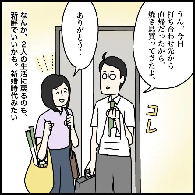 「うん、今日打ち合わせ先から直帰だったから。焼き鳥買ってきたよ」と袋を差し出す夫に、「ありがとう!」と伝える私。「なんか、2人の生活に戻るのも、新鮮でいいかも。新婚時代みたい!」とちょっぴりワクワクしていました。