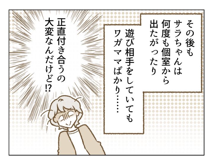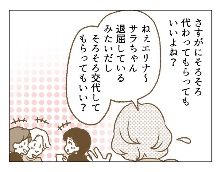 もうかれこれ1時間ほど子どもたちの相手をしているミキさん。サラちゃんのワガママ行動に、仕事をしている方がよっぽど楽だと思うほどぐったりしてしまっている様子です。そしてそんな様子が目に入らないのか、残る3人の大人たちは誰も助け舟を出してくれません。みんなちょっと配慮がなさすぎではありませんか? 友だちをこんな雑に扱っていいんですか? ついにミキさんも自分から「代わって」と言ったようですが、この反応……。代わってくれますよね?