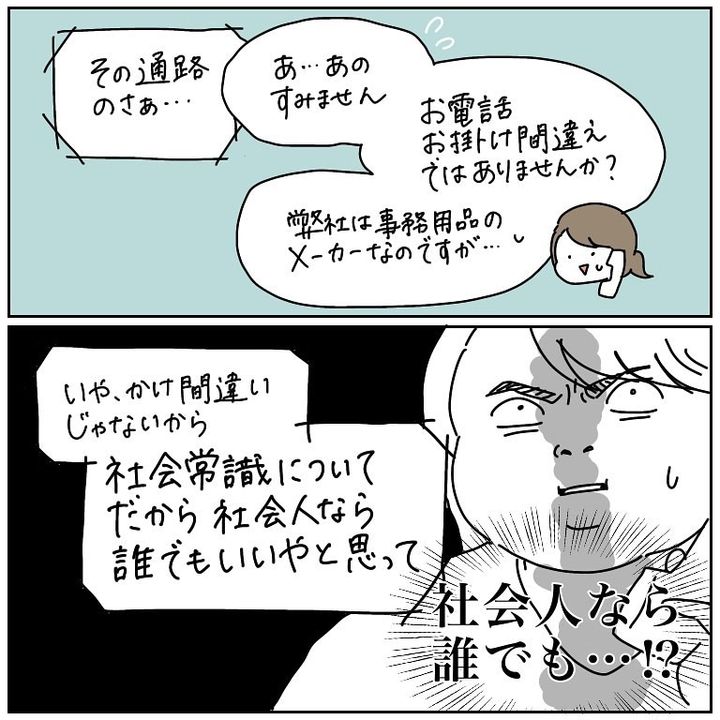 こんにちは!Instagramで日々の暮らしを漫画で紹介している、Web漫画家のmomoです。会社員時代、わたしが受けた電話の中で、今でも忘れられない衝撃的な間違い電話(?)をご紹介します。「社会常識について聞きたい」と言う相手からの、まさかの質問とは?みなさんの社会常識は、わたしと同じでしょうか…?