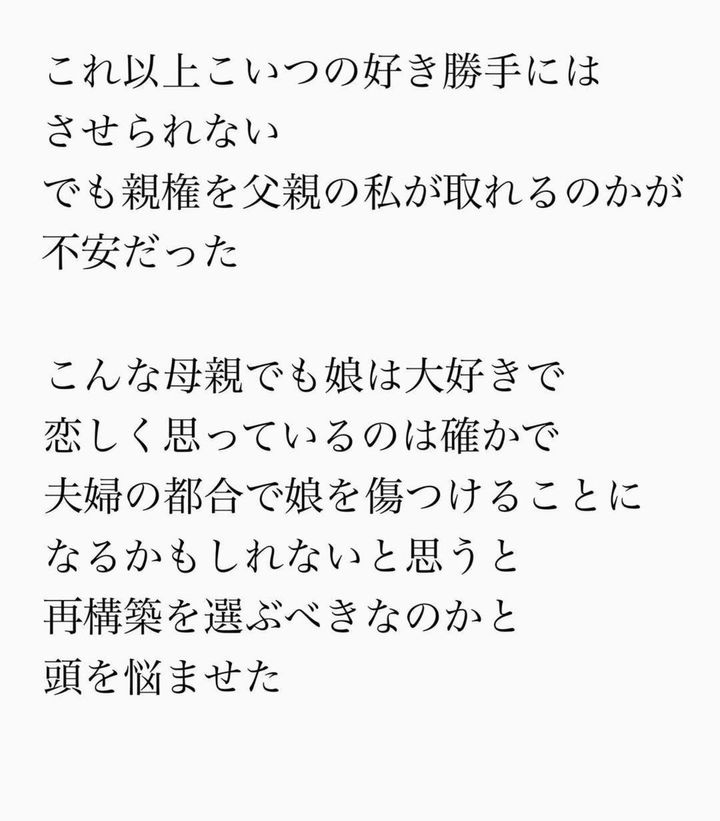 このあと、弁護士を通して離婚協議をすることになった、太一さん。最終的には離婚が成立し、娘の親権も無事に太一さんが獲得します。