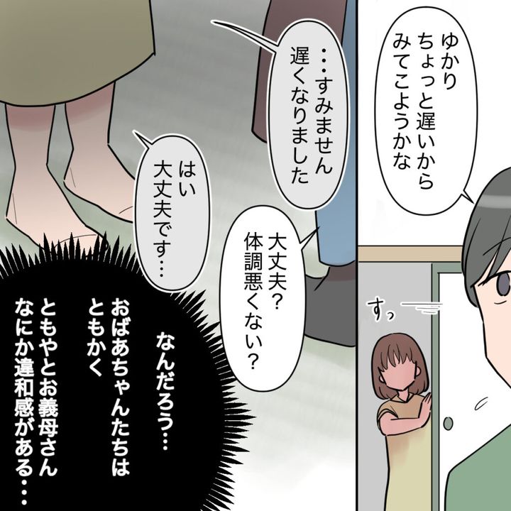 ともやが「ゆかり、ちょっと遅いから見てこようかな」とともやが言ったタイミングで、私は部屋に入りました。「大丈夫?体調悪くない?」と気遣ってもらいながら、何とも言えない気持ちでした。義祖父母はともかく、ともやと義母の違和感がなんだか違和感があるように感じていました。