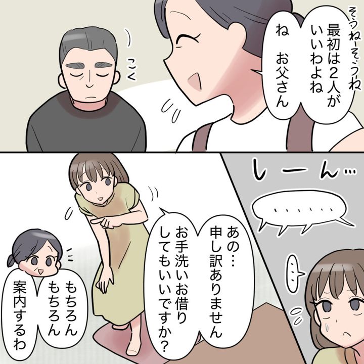 ともやの言葉を受けて「そうねそうね」と大袈裟に同意したよしこさんは、義父にも「最初は2人がいいわよね、ね、お父さん」と話を振りましたが、義父はただ黙って頷くだけ。