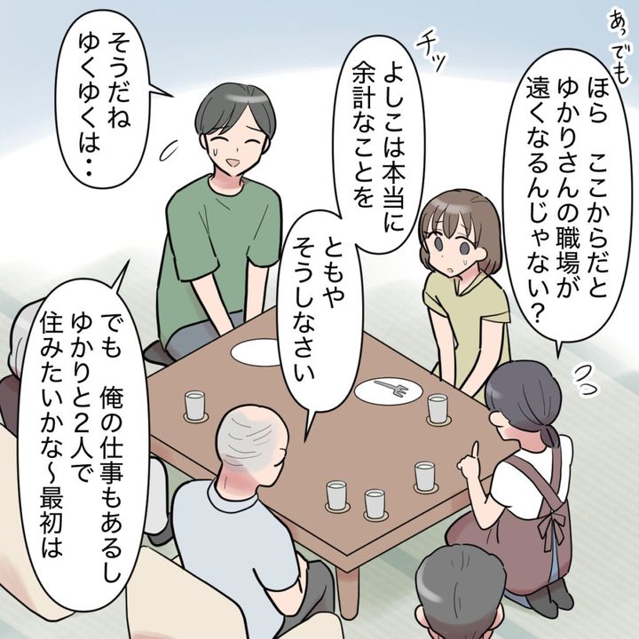 結婚してからの新居は、A市かB市で迷っていると伝えているにもかかわらず、もっと近くに住むように言い出した義祖父母がとうとう同居を提案し始めました。さりげなく実家から一番遠いB市が良いのではないかと勧める義母よしこさんは、同居の話を聞いて今度は「ここからだとゆかりさんの職場が遠くなるんじゃない?」となんとか阻止しようとしているように聞こえました。「よしこは本当に余計なことを」と舌打ちした義祖父がともやさんに同居にしなさいと伝えると、「そうだね、ゆくゆくは・・・」と苦笑いしたともやは、「でも俺の仕事もあるし、ゆかりと2人で住みたいかな~最初は。」と言いました。