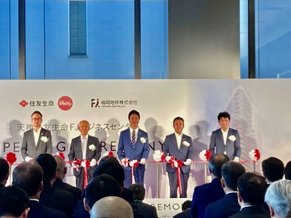 オープニングセレモニーには、このビルを共同開発された住友生命保険相互会社の高田社長や福岡地所株式会社の榎本取締役ファウンダーほか、福岡市の高島市長も登壇されました。高島市長の「ここで就職したい、働きたいと思うような価値を作れるかということが、これからのビル作りにおいて非常に大きいということを、まざまざと見せつけられた」という言葉に、このビルに対する大きな期待が感じられました。
