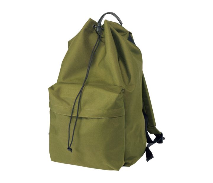アウトドア用品やワークウェアにも使われる、軽量で耐久性の高い〈アエタ〉のナイロン製バックパックに、カーキ色が仲間入り。巾着状のデザインなので開口部が大きく、中身が見やすく出し入れもしやすい。トップハンドルやジップの引き手には、カウレザーを使用。カジュアルになりすぎないから、幅広いシーンで重宝する。
