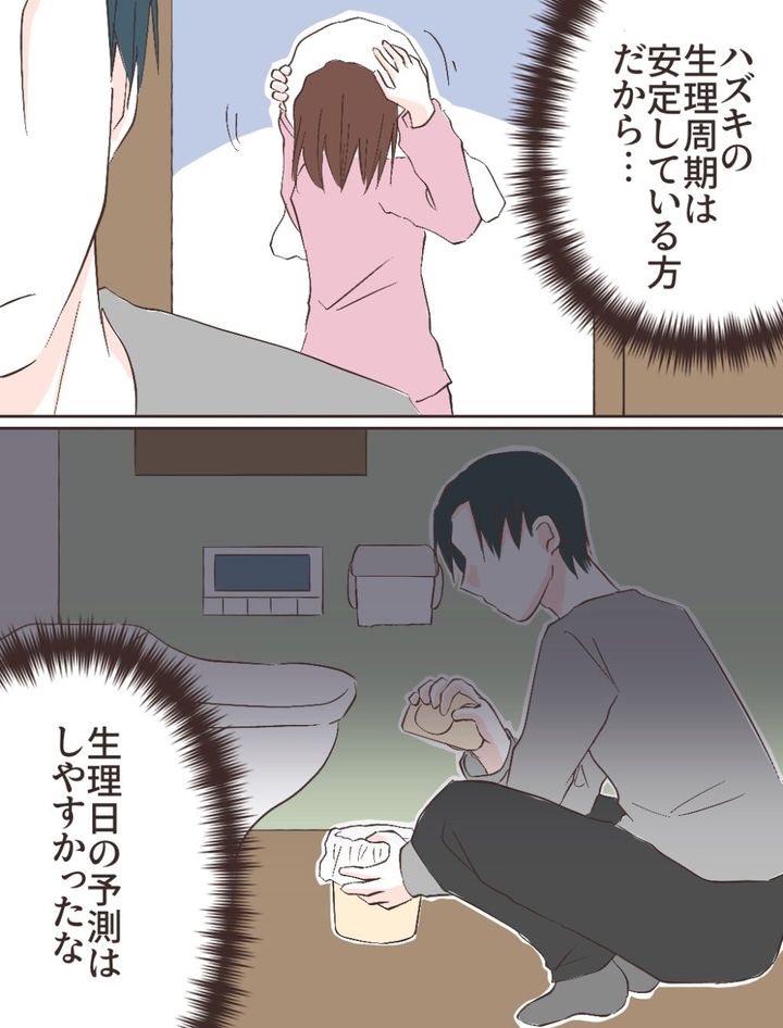 「ハズキの生理周期は安定している方だから・・整理日の予測はしやすかったな」どうやら、これまでトイレをチェックしたりして、生理周期を探っていた模様。