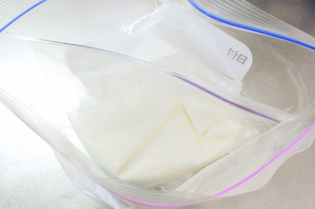 袋を振って凍らせるので、ヨーグルトドリンクがこぼれないように、口をしっかりと閉じ、氷入りの袋に入れます。薄い袋だと氷の角で破れる恐れがあるとのこと。必ず、ジッパー付き保存袋のような厚めの袋をお使いくださいね。