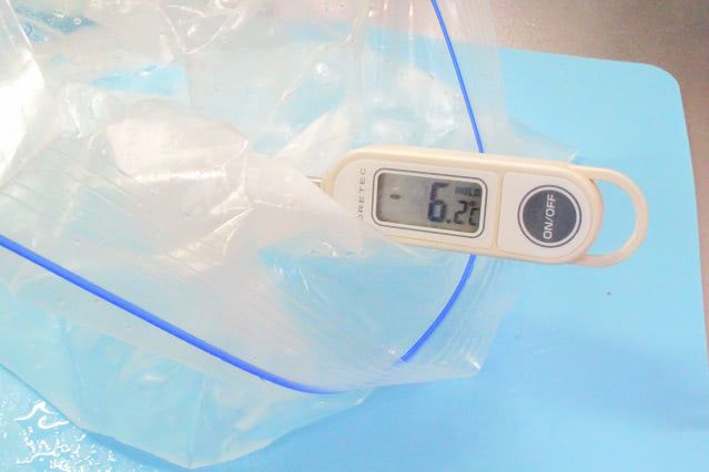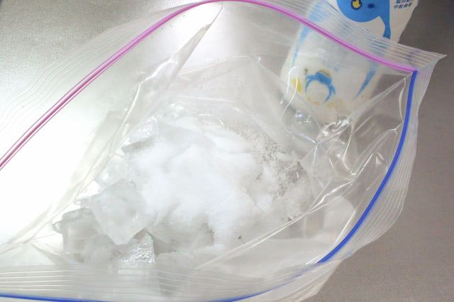 また、塩を振りかけた氷は溶けるのが速く、追加の氷が必要になるので、多めに用意しておくのがおすすめです。そして、高濃度の塩水が出来るので、手に傷がある場合はかなり染みます。手袋をして袋を振ると、安心ですよ。