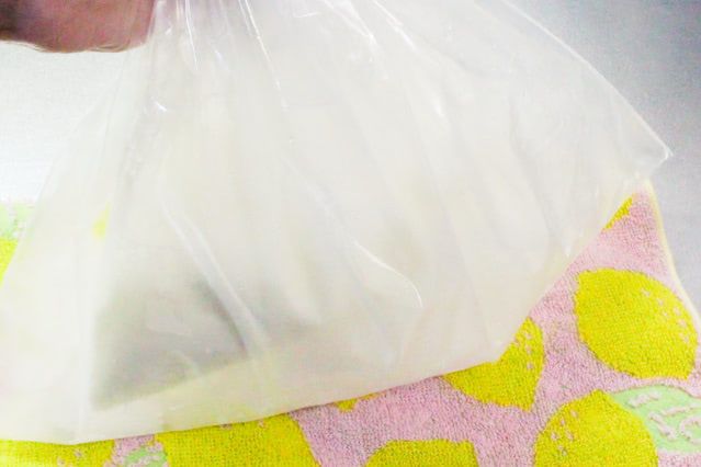 そこで再度、氷水が入った袋に入れ、今度は、タオルの上に袋を乗せたまま左右に揺らしてヨーグルトドリンクを3分ほど混ぜ続けました。