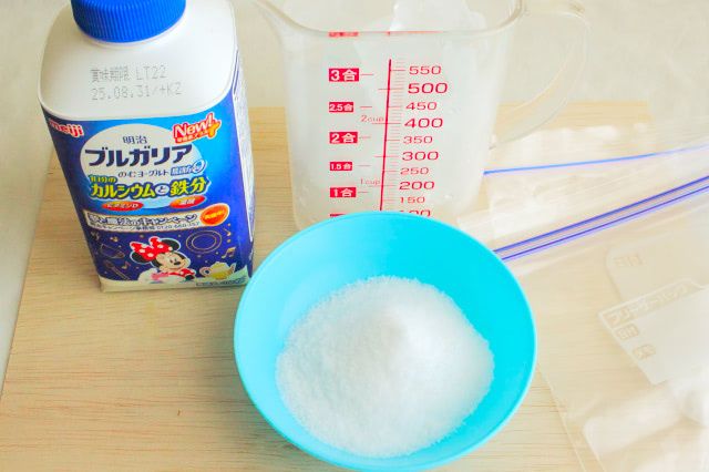 氷に塩を振ると0℃以下になるため、液体のヨーグルトドリンクをすばやく凍らせることが出来ますよ。