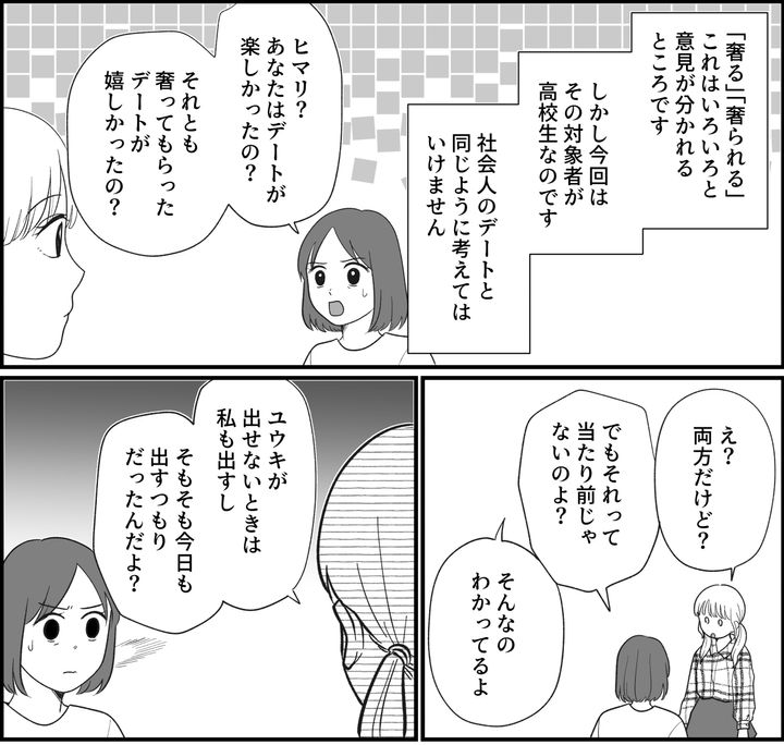 何やら「奢る」というテーマでずいぶんと盛り上がりを見せている2人に、私はどこから突っ込んでいいのか分かりません。「奢る」「奢られる」これは男女のデートにおいて、いろいろと意見が分かれるところです。ユウキくんがデートで奢ってくれたことを褒めたたえる2人に、私はさらに苦言を呈します。
