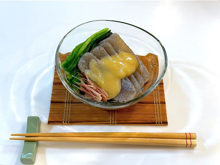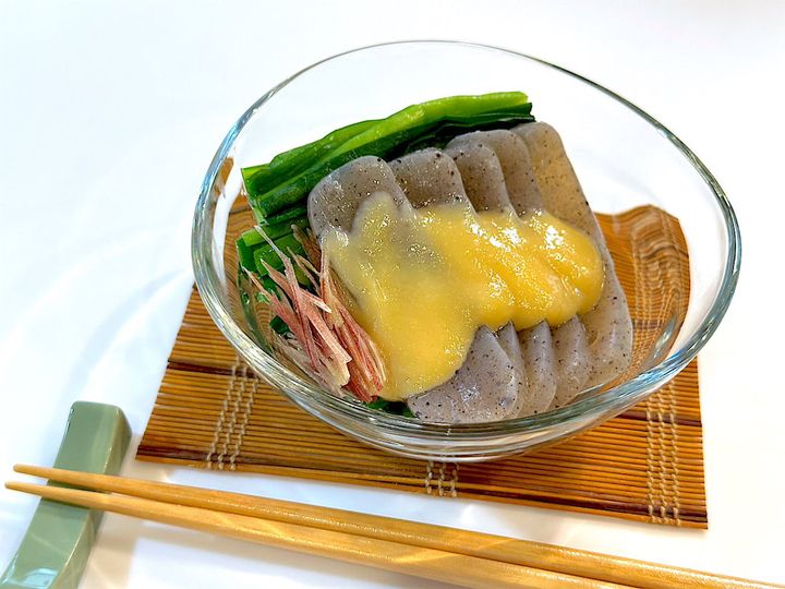 つややかな酢味噌がかかったこんにゃくに、鮮やかな緑色のニラ。