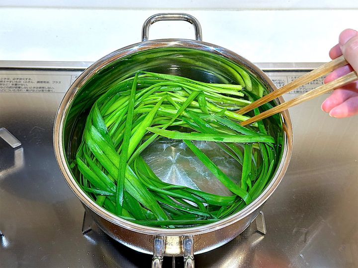 このあとニラも茹でるので、鍋のお湯は捨てないでくださいね。